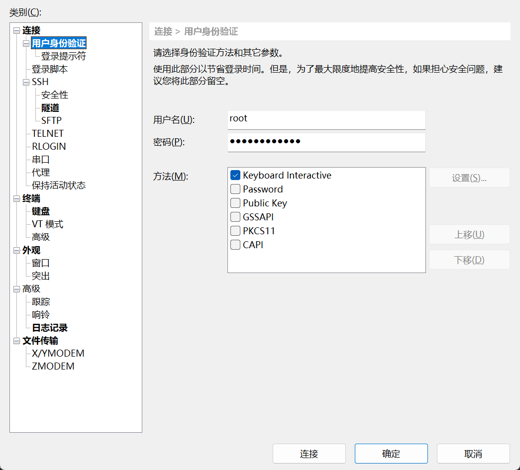 做完了以后,去将 root 用户的登录认证改为 Keyboard Interactive,我使用的是 Xshell。